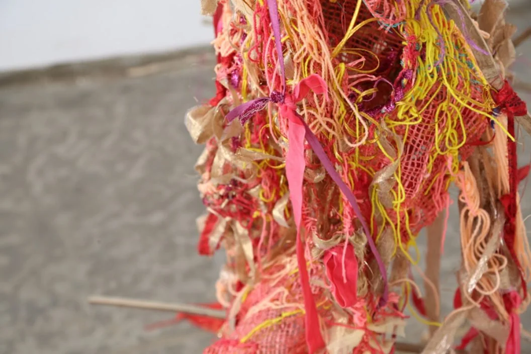 What if my threads are debris? What if my sacred threads are just debris? Then I am homeless. Then I am spending all my time trying to build shelters for myself. Trying to find places to put my bones. The word iwi means bones. What if I put flowers on my threads? Explosions of determined blooming are happening here. ft cannot be prevented. 1 am unable to be held down – no matter my threads unknown. No matter my unstructured pepeha. Both fragility and grit go together. These are my karanga. When 1 stand mate wahine on the paepae (on the border) 1 am an open thread to the world of te po. 1 am walking fearlessly in a place not everyone can go. I can travel to the darkness … and back. What if I cannot build? What if I cannot make myself stand? What if sticks and stones have broken my bones/my iwilk6iwi? I have cut my hair in grief. A thousand strands have fallen to the earth and from them grew all of the colours. Flight has wings. My moko kauae. Tawhirimatea is the unstoppable force of nature who cares not that you disagree, that you dislike. In the topknot. The threads I have dropped are ladders from you to me and from me to you. Hine. Mawhero came from the first woman. Her cheeks were it. Her breasts were it. Her womb sheltered it. ft is te ara, the pathway.