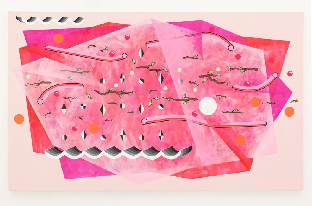 Time Travel & the Invisible Body is an edited selection of recent paintings. It extends Ben’s interest in ‘pattern-making’ and abstraction, involving elements of illustration in that explore the painting’s potential to hold mauri. He creates works in groups and describes them as ‘friends’ who generate kōrero amongst one another. They talk of the complexities of life in the Anthropocene and offer critique around individual and community responsibility in this reality.